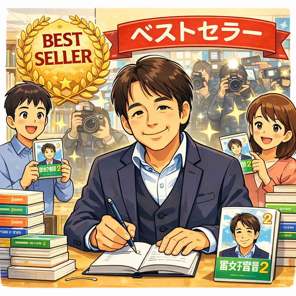 Chat GPTに 「永田 ベストセラー作家になる」をイラストにと指示すると、