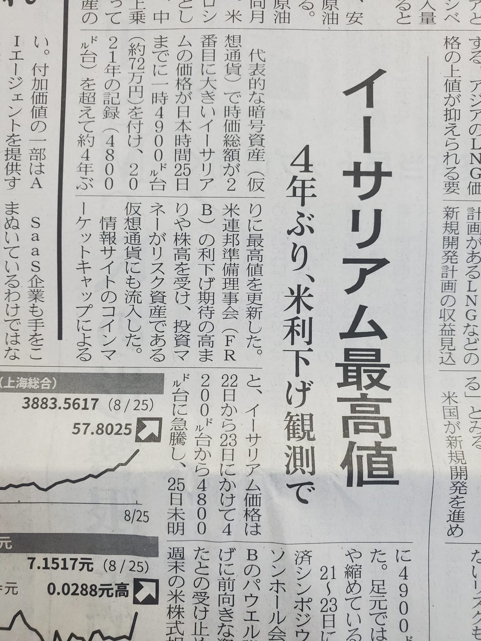 本日の日経新聞にも、暗号通貨の中で、ビットコインに次いで、2番目に時価総額の大きい「イーサリアム」が最高値を更新したとの記事が出ていました。